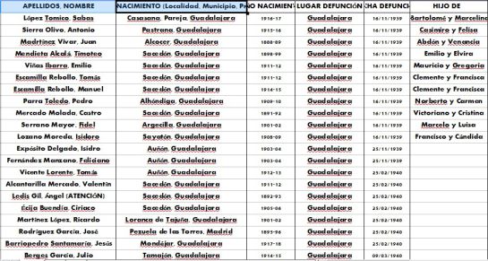 «El informe, fechado el 27 de junio de 2014 y remitido al Juzgado de Instrucción Número 1 de Guadalajara, explica que la fosa en la que fue enterrado Timoteo es una fosa común cuyo primer enterramiento data del 16 de noviembre de 1939 y el último el 9 de septiembre del mismo año. En la fosa se enterraron, según consta en el informe, 22 o 23 personas ejecutadas por el Juzgado Especial de Ejecuciones, según los distintos registros«.
