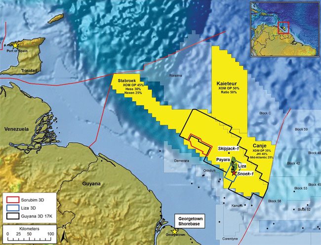 Cabe precisar que los yacimientos de hidrocarburos concesionados a Exxon Mobil no se encuentran en el territorio de Guyana sino en las zonas marítimas adyacentes, cercanas a la desembocadura del Río Esequibo: la soberanía sobre estas zonas marítimas depende de la proyección que se haga de la frontera terrestre en el mar. Los bloques concesionados por Guyana a Exxon Mobil pueden ser observados en diversos mapas como por ejemplo en este artículo de Offshore.mag titulado «E&P activity on the rise offshore Guyana». El 20 de mayo del 2015, Exxon Mobil anunció el descubrimiento de un importante yacimiento frente a las costas de Guyana (véase comunicado de prensa). El 26 de mayo del 2015, Venezuela adoptó un Decreto que crea las Zonas Operativas de Defensa Integral Marítima e Insular (ZODIMAIN), las cuales abarcan parte del territorio marítimo pretendido por Guyana (véase decreto publicado en la Gaceta Oficial, pp. 420-896 / 420-901).