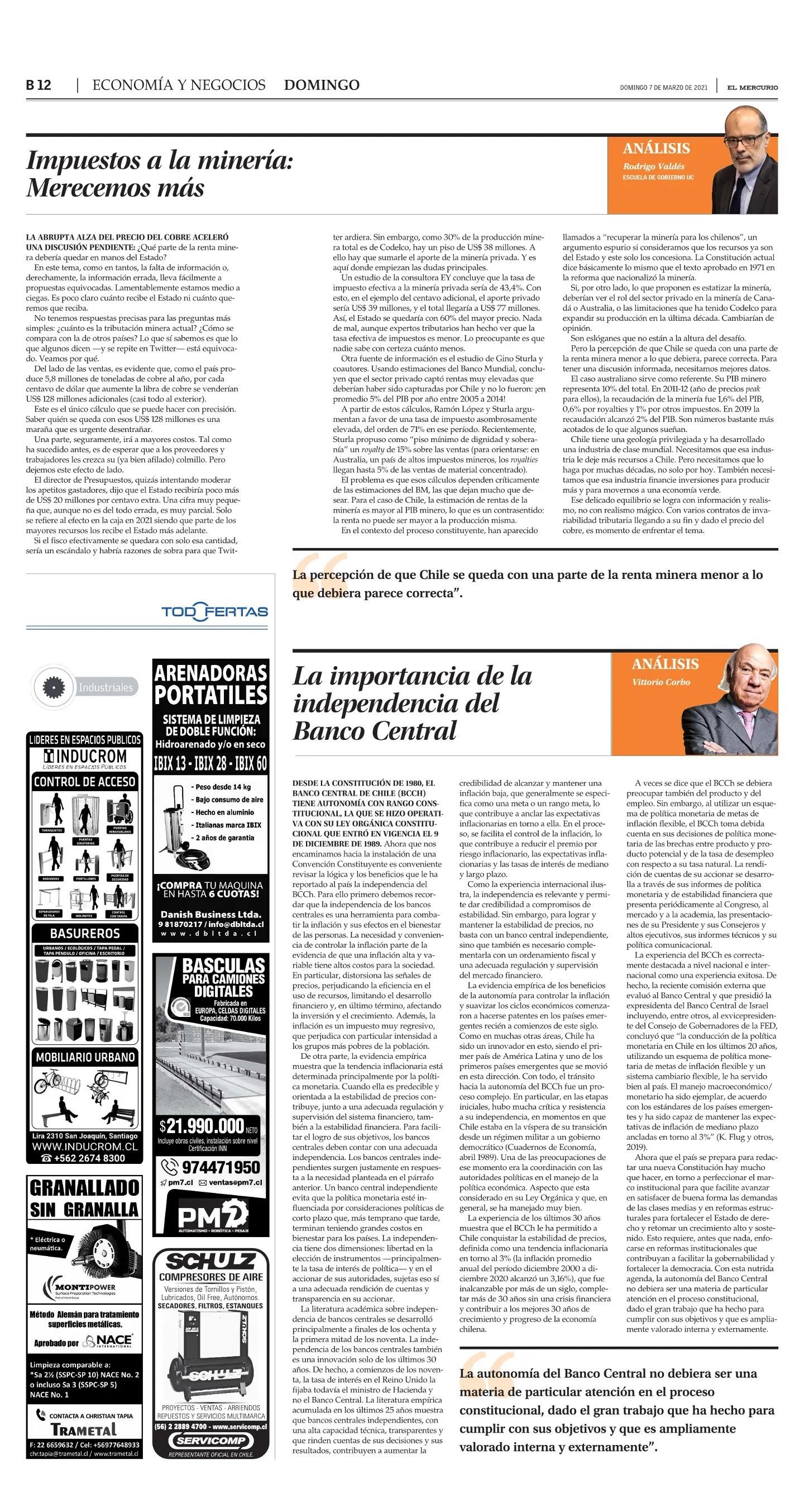 Es lo que hace el ex ministro de Hacienda de la Presidente Bachelet, Rodrigo Valdés, que en una columna de Economía y Negocios de El Mercurio del domingo 7 de marzo, titulada “Impuesto a la Minería: Merecemos más”, sostiene: