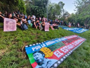 En las faldas del Winkul Huelén (Cerro Santa Lucía) se desarrolló una manifestación autoconvocada por organizaciones sociales y comunitarias, que reunieron a decenas de personas con lienzos, afafanes y discursos de denuncia contra el Estado y sus poderes relacionados con la justicia y sus instituciones.