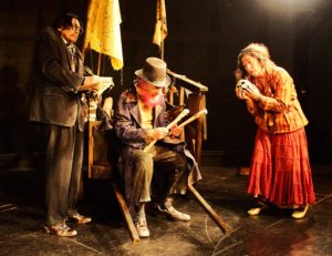 En esta creación, tres figuras —Chicho, Mateo y Virgen— empujan una carreta por un desierto que podría ser Atacama o cualquier territorio arrasado por la codicia. No son héroes ni mártires, sino restos de humanidad en tránsito. Llevan huesos, trastos y consignas que resuenan como relámpagos de humor desesperado: “¡Menos bombas, más empanadas!” o “¡Maten al odio, no al vecino!”. En esa carcajada deformada se instala la tragedia de nuestro tiempo.