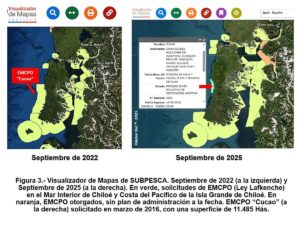 La Figura 3 siguiente muestra la totalidad de Espacios Marino-Costeros de los Pueblos Originarios que se han solicitado en el Mar Interior de la Región de Los Lagos (Seno del Reloncaví y Mar Interior de Chiloé) a Septiembre de 2022 y Septiembre de 2025.