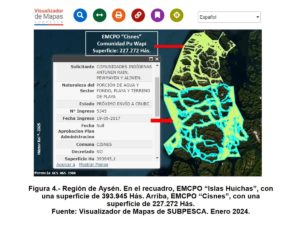 La Figura 4 siguiente muestra la dimensión que tenían las más de 600.000 hectáreas solicitadas por cuatro comunidades indígenas (que sumaban unas 40 personas de origen indígena) en la Región de Aysén y que durante SIETE AÑOS paralizaron las modificaciones y ampliaciones de la infraestructura productiva en el Mar Interior de la Región de Aysén.