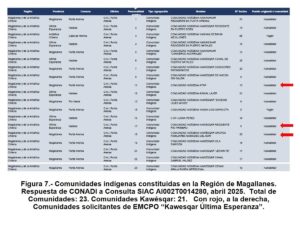 En ella, como muestra la Figura, CONADI señaló que en Magallanes se reconocen 23 comunidades indígenas, de las cuales 21 son Kawésqar, con unos 300 integrantes en total. Es decir, las Comunidades solicitantes del EMCPO “Kawesqar Última Esperanza” son absolutamente MINORITARIAS respecto al número de Comunidades reconocidas por CONADI (3 de 21) y al tamaño de la población kawesqar allí organizada (algo más del 10% del total de población kawésqar organizada).