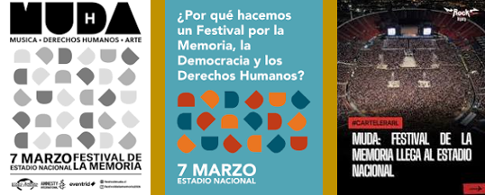 Así, buscando en internet llegué a la página web oficial de dicho evento que se define como un Festival de la Memoria, con música, derechos humanos y arte. En un pequeño video se promocionan los artistas que estarán presentes en este evento que aparece pratrocinado en dicho video por Estadio Nacional Memoria Nacional, Amnesty International y Eventrid. Esta última se define como una “plataforma líder en gestión de eventos y venta de entradas”.