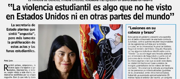 Resulta fascinante —en un sentido casi antropológico— leer su entrevista y su afirmación de que la violencia estudiantil “no la ha visto usted en Estados Unidos ni en otras partes del mundo”. (Red. piensaChile: ver entrevista más abajo.) Fascinante, porque obliga a preguntarse si estamos ante una declaración de desconocimiento, de negación… o de simple descuido intelectual.
