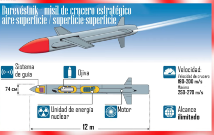 Es ruso, vuela casi al ras del suelo, serpenteando el relieve del terreno de forma autónoma durante semanas, es nuclear, con alcance global, prácticamente indetectable y está solo a la espera de la orden de atacar. No es un mito, es el nuevo misil de crucero intercontinental ruso Burevéstnik.